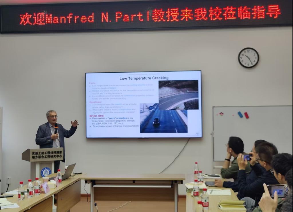 2025年10月28日,交通土建工程材料国家地方联合工程研究中心(以下简称“中心”)举办了题为Mechanical Performance of Sustainable Asphalt Pavement Materials(《可持续沥青路面材料力学性能研究前沿》)的学术讲座。受邀主讲嘉宾为瑞典皇家理工学院Manfred N.Partl教授,中心常务副主任朱洪洲教授以及相关学科的教师和研究生参加了本次学术活动。讲座由中心李睿副教授主持。